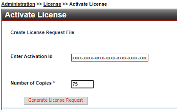 1. Return to the Activate License screen within VoiceConsole and enter the Activation ID and the total license quantity in the Activate license fields. The quantity of licenses to activate must be less than or equal to the total purchased. Click Generate License Request