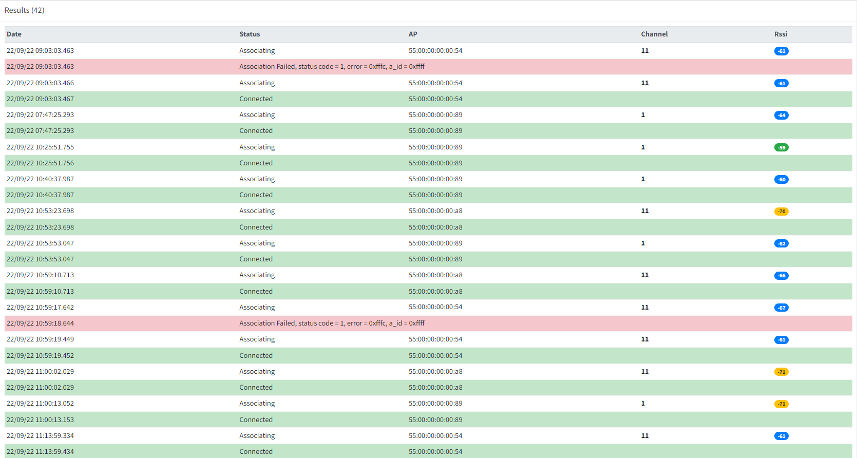 This list shows all registered network events ordered on the timeline, showing the network event date and time, status, destination AP, channel, and RSSI value for each event. Depending on the event, the Status shown in the list can be:
