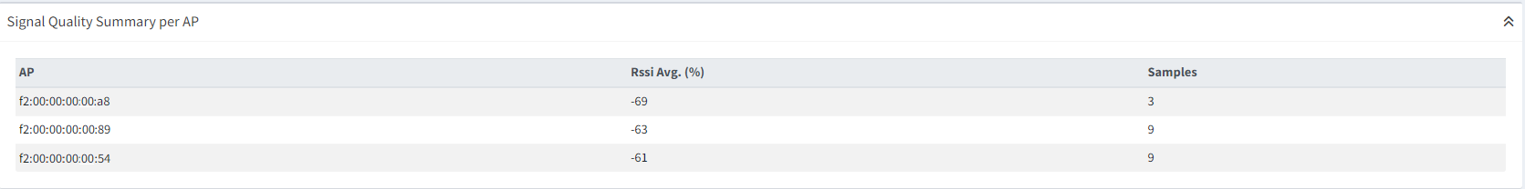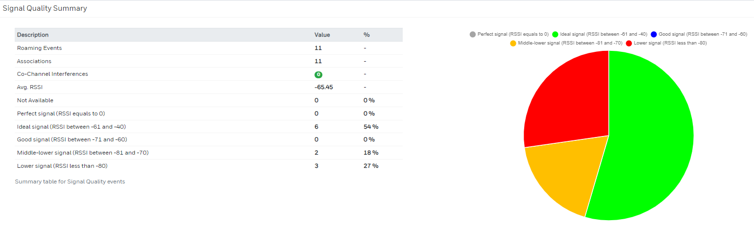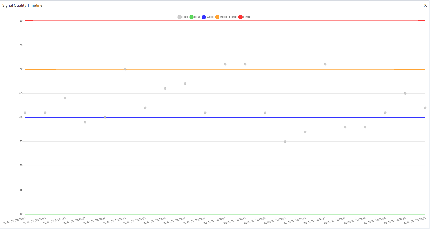 In this graph, view the RSSI value within the timeline, with horizontal color lines to separate the quality group classification (Ideal, Good, Middle-Lower, Lower). Values are here represented by a scale from 0 to -80 RSSI -it should be noted that the range of values represented may vary between different device manufacturers and are not completely standardized: