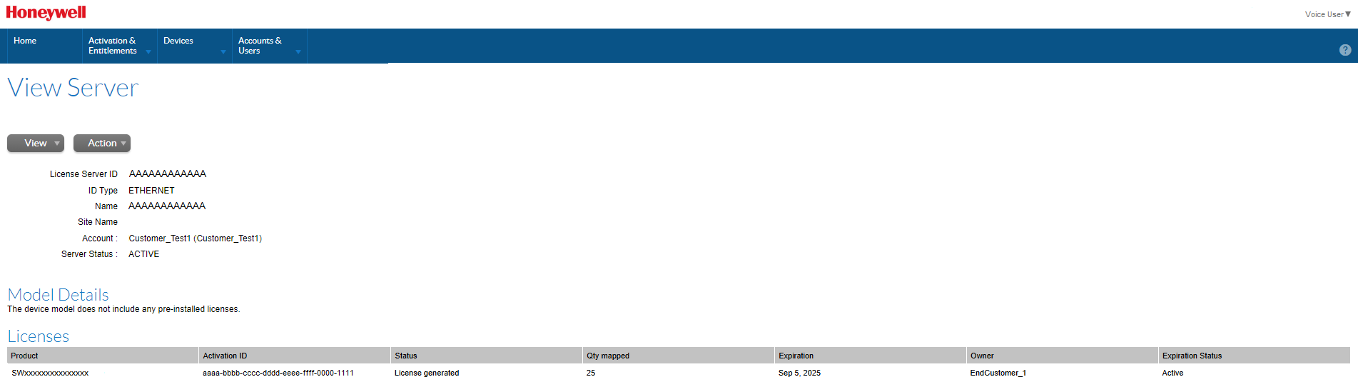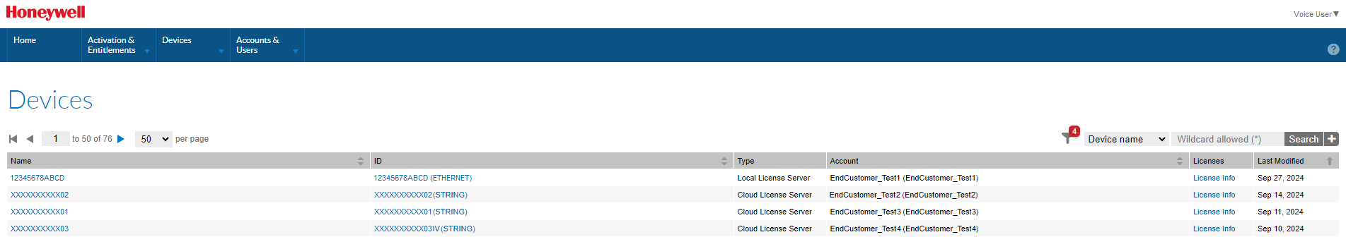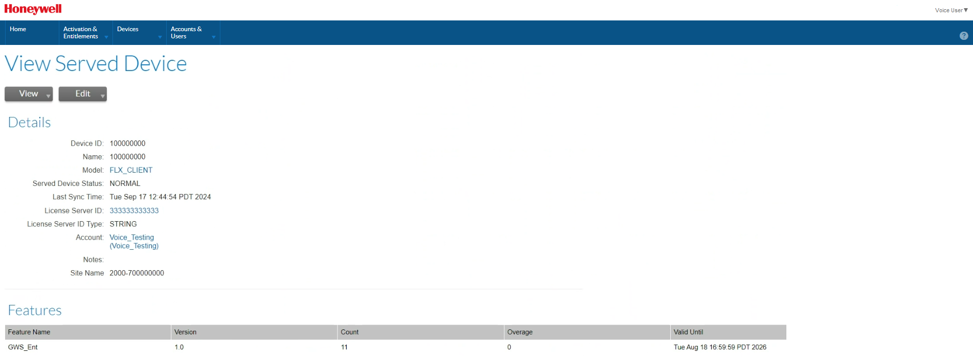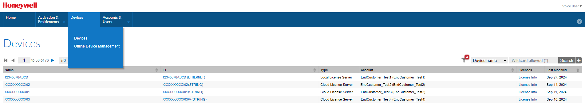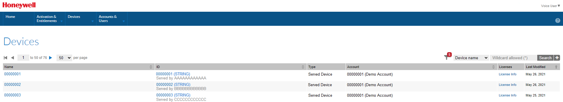 Type: Indicates the type of device. Valid types are Local License Server, Cloud License Server, and Served Devices. Served Devices are the Voice devices connected to a Cloud License Server. Voice licenses do not include Standalone Devices, but they may be displayed if you have licenses for other Honeywell products.