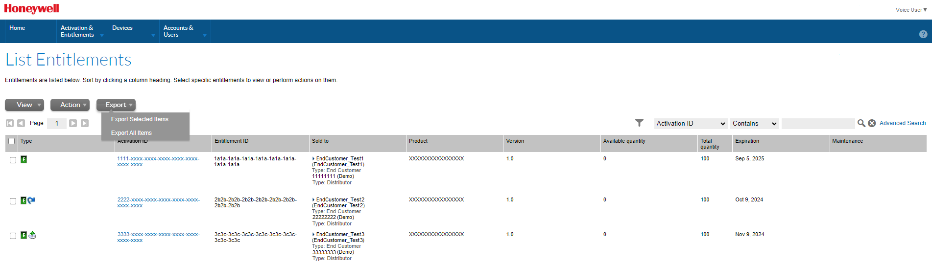 You can export all entitlements or you can select one or more entitlements and export those selected items.