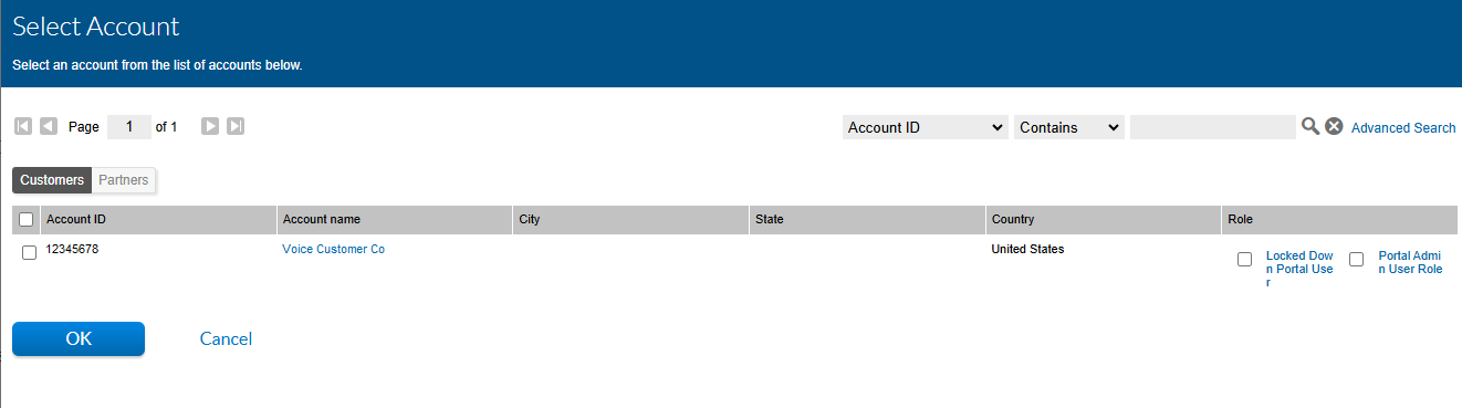 Select an account from the list and then select a role. For the role, select Portal Admin User Role. Click OK.