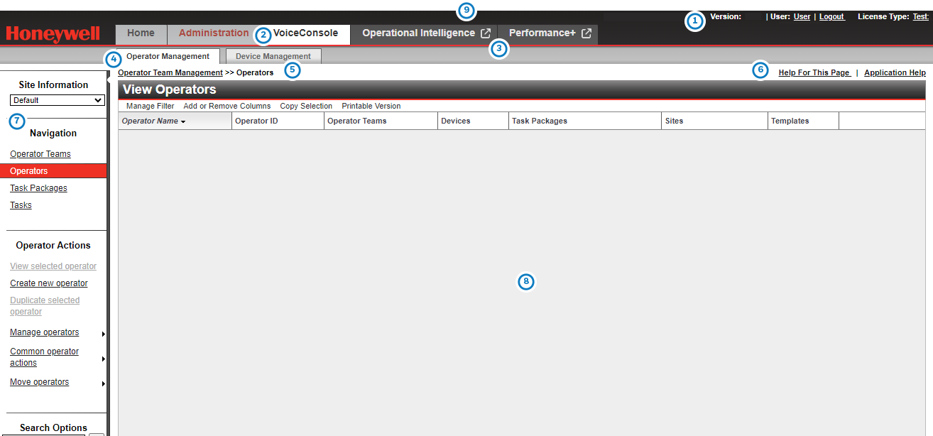 - Management Tabs: This area is displayed when viewing the VoiceConsole tab. Operator Management and Device Management are displayed here. You can click on the different Management tabs to view data specific to operators or devices.