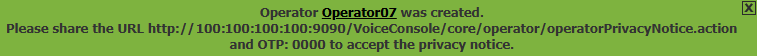 This message displays the Operator Name and OTP. The operator must use the Operator ID (not the Operator Name) when accepting the privacy notice.